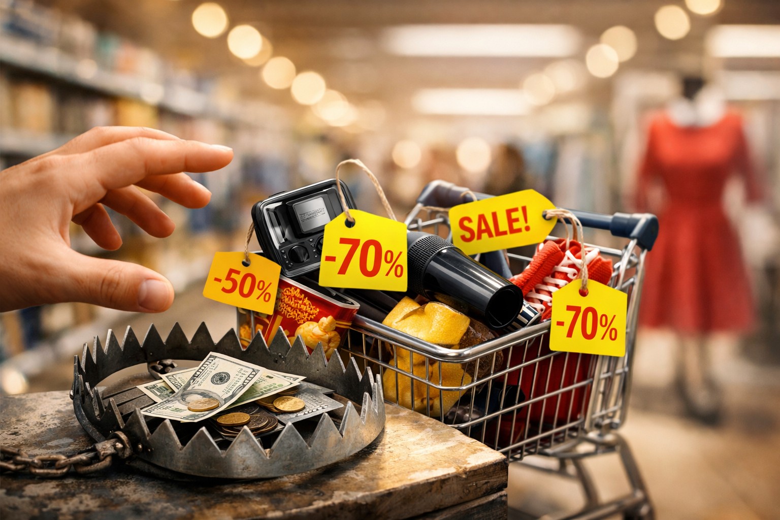 Једна од најефикаснијих техника је стварање илузије ограниченог времена или количине. Провоцирају фразе попут „само данас“ или „последња копија“. страх од пропуштања. У овом стању, особа престаје да упоређује цене и анализира стварну потребу за производом. У ствари, већина ових артикала се враћа на полице са истим попустом у року од недељу дана.